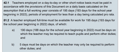 190 days (188 days for the school year beginning in 2022) must be days on which the teacher may be required to teach pupils and perform other duties; and