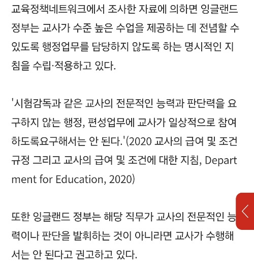 영국에서 교사에게 행정업무를 요구할 수 없도록 명문화하였으니, 우리도 그렇게 하자는 주장인 것 같다.
