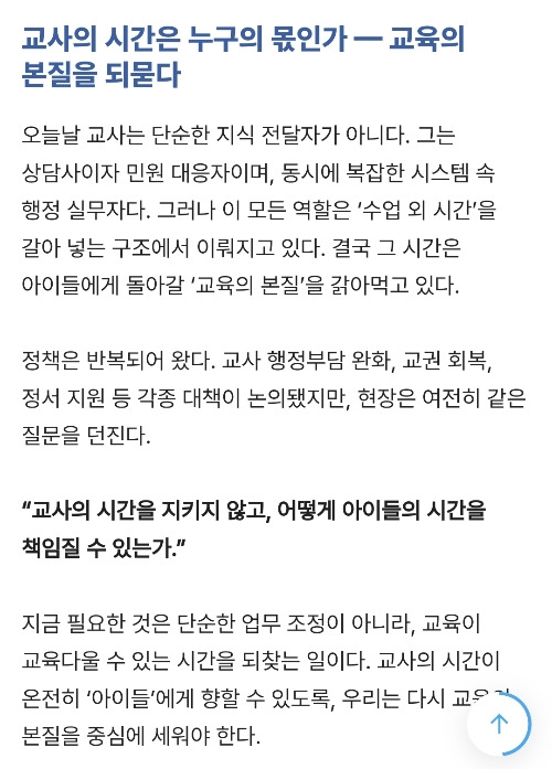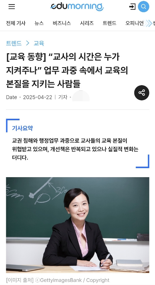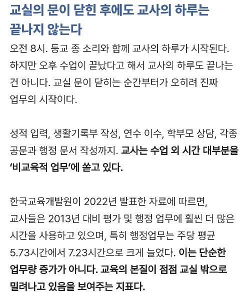상상을 해보자면, 이 기자는 교사를 신성시하다 보니 '그래서 업무경감과 업무조정이 필요하다'는 식의 '일반적인 결론'을 내기 송구했던 것 같다.