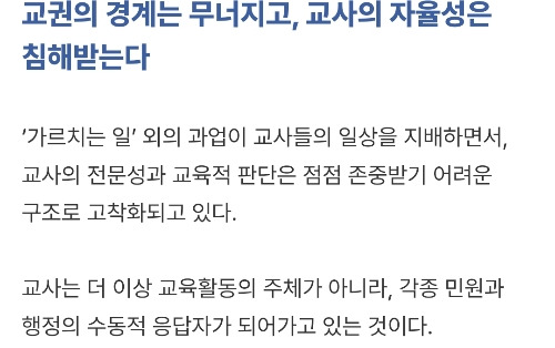 이것은 '민원과 행정의 수동적 응답자가 되니 자율성이 침해받는다'로 해석할 수 있는데, 도대체 교사의 자율성을 뭐라고 생각하는 걸까.