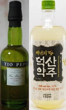 한약재 내음이 풍기는 누룩의 맛(누룩취)인 약주와 플로르라는 자연 효모가 내려앉아 향이 밴 셰리의 맛을 연결시켜 볼 수 있다.