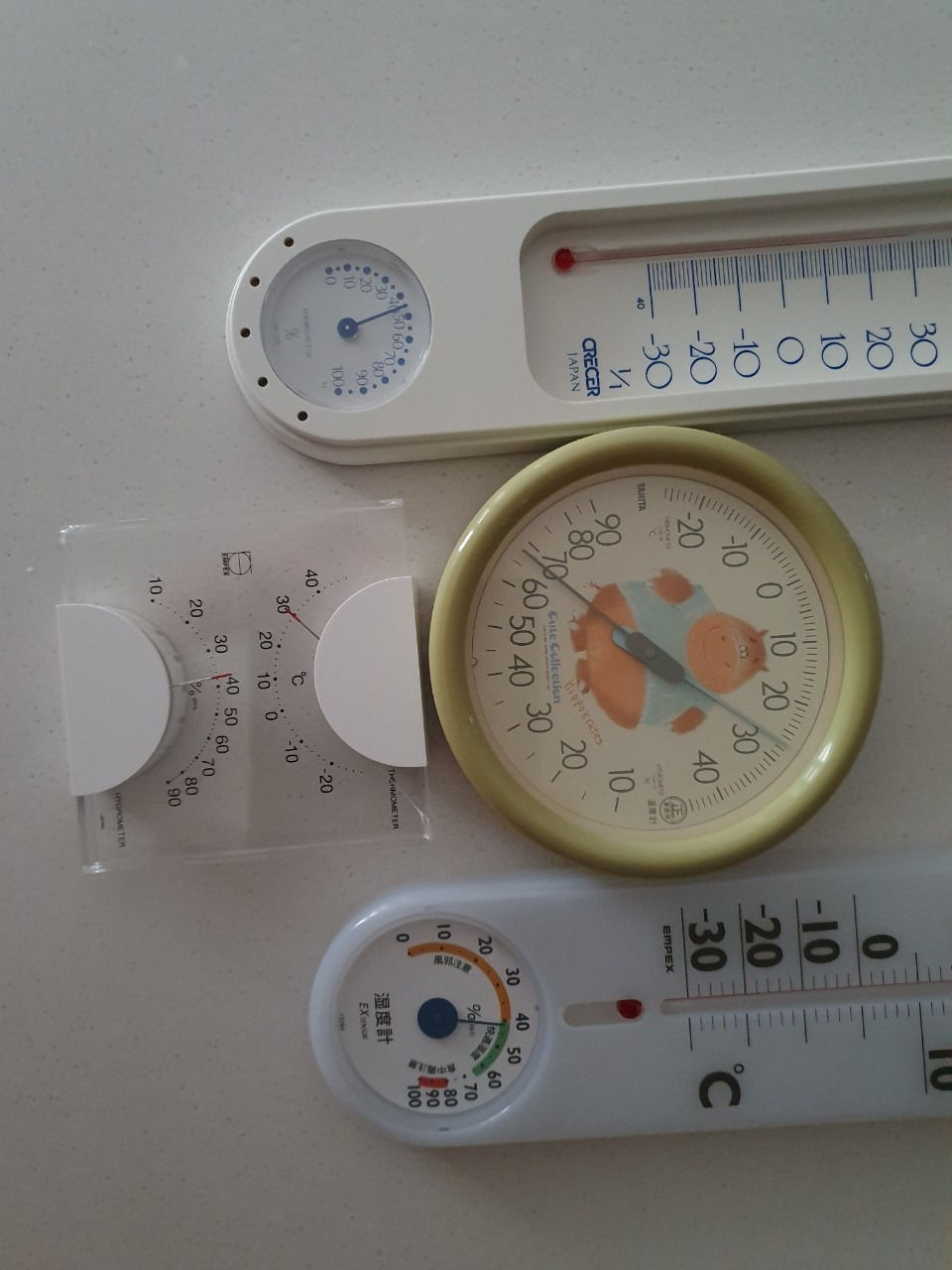 결과는 충격적이었다. 동일한 위치에서 쟀는데도 4개 각각 전혀 다른 수치를 가리키고 있었기 때문이다. 가장 습도가 낮게 표기된 제품은 38%, 그다음이 42%, 45%를 보이는가 하면 최고 높게 나타난 것은 무려 68%로 표시되는 등 가늠조차 어려웠다. 적어도 3개, 아니면 전부 다 엉터리라는 소리 밖에 되지 않는다. 제일 낮은 숫자와 높은 것을 제외하고 중간값 2개의 평균을 내어 43.5%로 어림짐작할 밖에 도리가 없었다. 그동안 일본 제품의 정확성과 정밀함을 의구심 없이 맹신해 온 듯하여 낯이 뜨거워졌다. 현재는 가장 믿을만한 독일제 습도계를 구입하여 중심을 잡는다.
