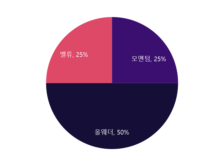 올웨더, 밸류, 모멘텀 전략 3가지 전략을 구성한 후, 자산배분을 하듯이 이 3개의 전략에 배분을 합니다.