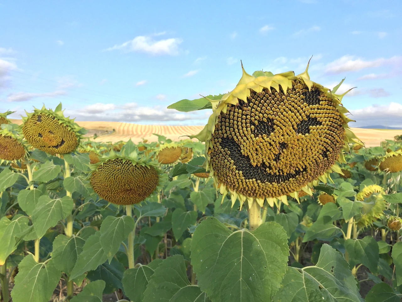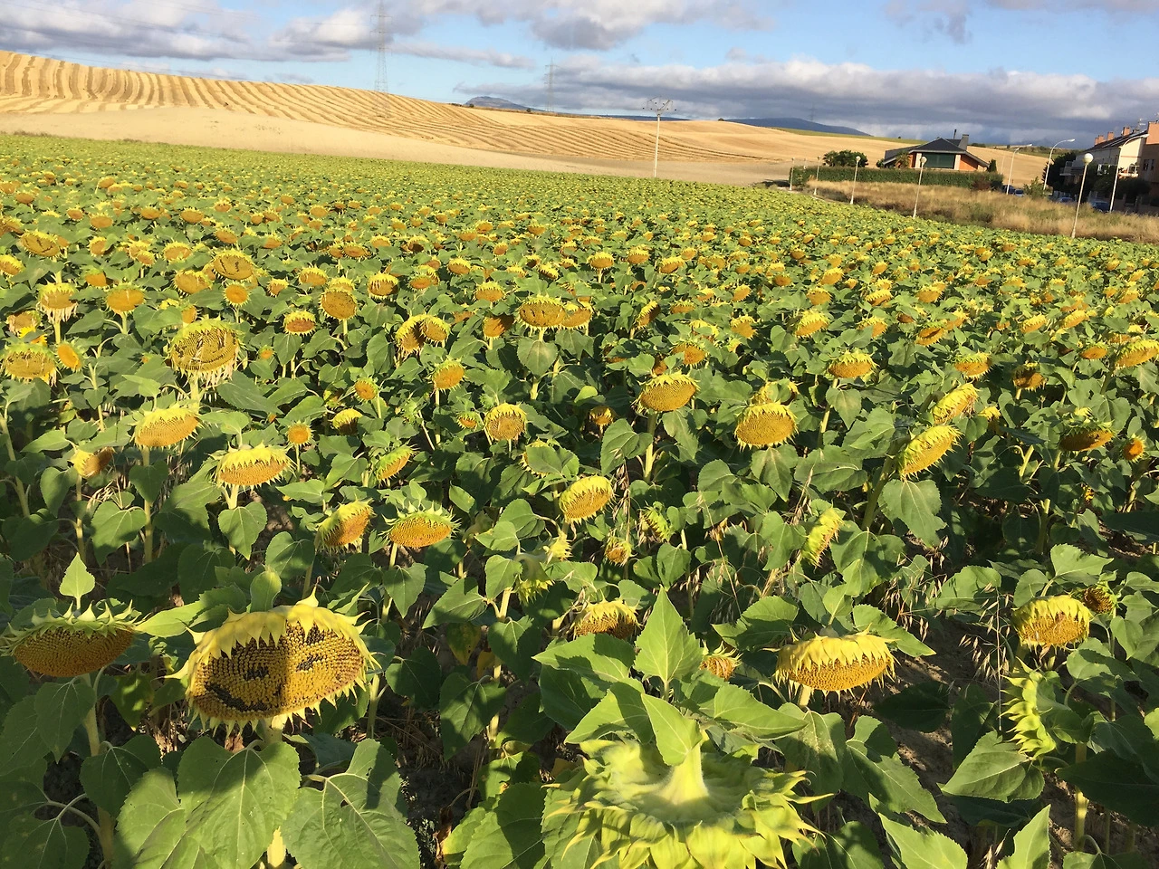 오늘의 길 위에는 끝도 없이 펼쳐진 해바라기 밭이 장관을 이루고 있었다. 그림을 그릴 수 있었다면 당장이라도 앉아서 그리고 싶을 만큼 아름다웠던 길. 누군가의 장난인지, 혹은 우연히 떨어진 씨앗의 선물인지 모를 웃는 얼굴 모양 해바라기부터 노란 화살표 모양의 해바라기까지... 그 아름다움에 매료되어 잠시 걸음을 멈추고 사진을 찍느라 정신이 없었다.