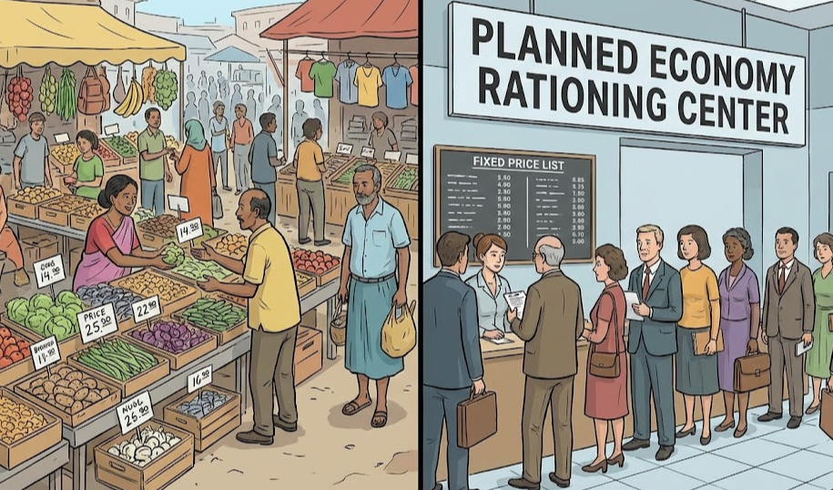 그렇다면 시장경제와 계획경제의 차이는 무엇이냐? 이건 "가격이나 물량을 누가 결정하느냐?"에 대한 대답이다. 시장에서 수요와 공급에 따라 자유롭게 결정하게 냅두는 시스템이면 시장경제이고, 나라에서 "올해는 아파트 100채만 짓고 라면은 500원에 팔아"라고 결정해주면 계획경제 시스템이다.