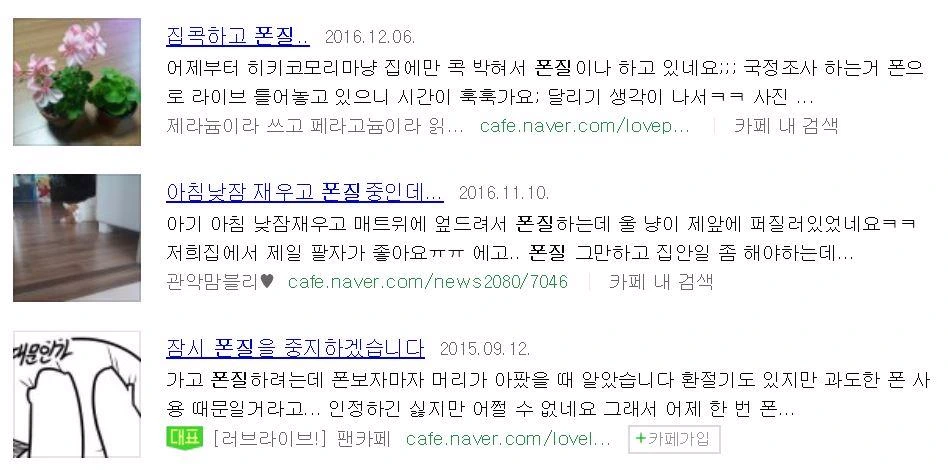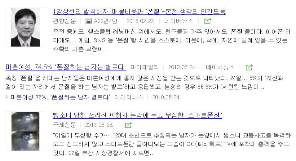 이런 전제를 생각하고 본다면 '폰질'이란 단어가 가치중립적인 단어로 사용되는 것은 아닌 것 같다. 인터넷에서 '폰질'을 검색해 보았더니
