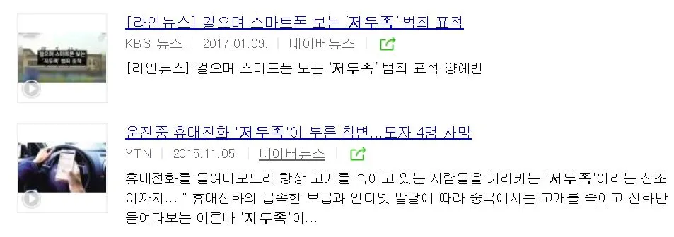 요즘 중국에서 새로 생긴 신조어로 저두족이란 단어가 있다고 한다. 폰질을 하느라 고개를 푹 숙이고 다니는 사람들을 일컫는 말이라고 한다. 중국 통계로 90년대 이후 출생자의 60%가 스마트폰 중독이라니 우리나라는 더하면 더했지 덜하지는 않을 것이다.