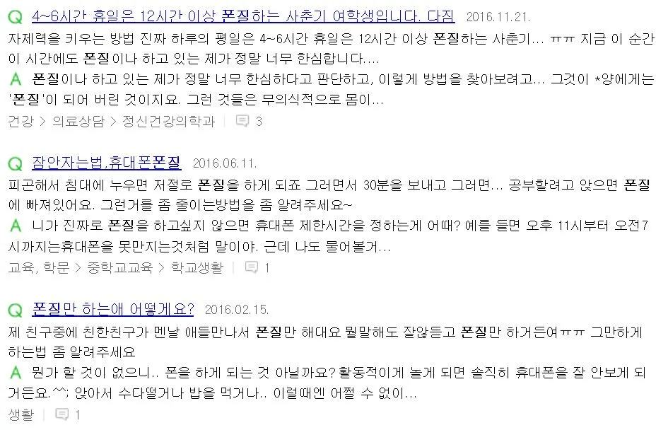 또는 폰질을 생활에 도움이 되지 않거나 자신의 생활을 방해하지만 끊기 힘든 일로 생각하는 부정적 의미로 사용하는 경우도 다수 있었다