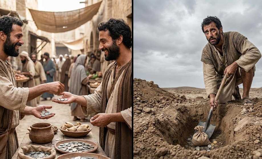 18 한 달란트 받은 자는 가서 땅을 파고 그 주인의 돈을 감추어 두었더니