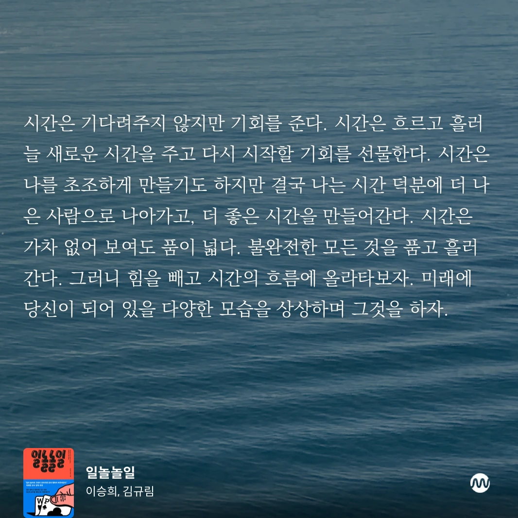 시간은 기다려주지 않지만 기회를 준다. 시간은 흐르고 흘러 늘 새로운 시간을 주고 다시 시작할 기회를 선물한다. 시간은 나를 초조하게 만들기도 하지만 결국 나는 시간 덕분에 더 나은 사람으로 나아가고, 더 좋은 시간을 만들어간다. 시간은 가차 없어 보여도 품이 넓다. 불완전한 모든 것을 품고 흘러간다. 그러니 힘을 빼고 시간의 흐름에 올라타보자. 미래에 당신이 되어 있을 다양한 모습을 상상하며 그것을 하자.