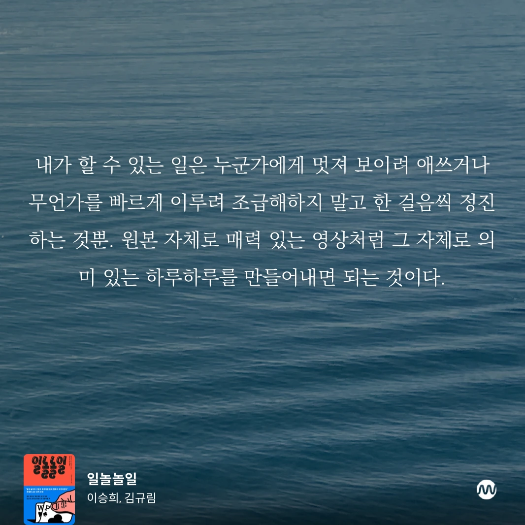 내가 할 수 있는 일은 누군가에게 멋져 보이려 애쓰거나 무언가를 빠르게 이루려 조급해하지 말고 한 걸음씩 정진하는 것뿐. 원본 자체로 매력 있는 영상처럼 그 자체로 의미 있는 하루하루를 만들어내면 되는 것이다. - <일놀놀일>, 김규림 이승희