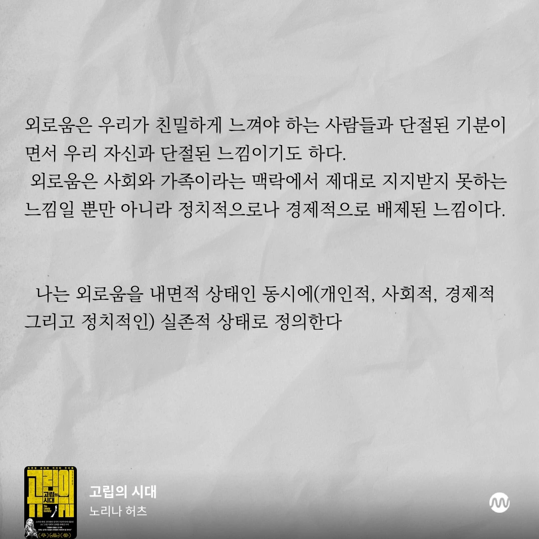 외로움은 그저 ‘혼자 있는 느낌’이 아니다. 단절된 느낌과 현실, 그로인해 괴리감을 경험하고 이어지는 좌절감으로 인해 앞으로 나아가지 못하는 답답함. 이러지도 저러지도 못하는, 바닥까지 납작해지는 경험... 그렇게 외로움은 삶을 잠식하고, 마침표를 향한다.