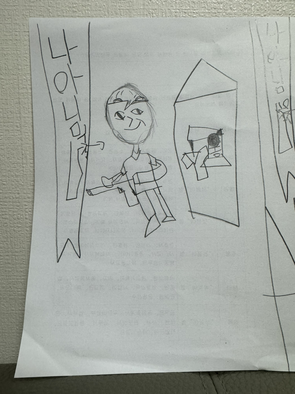 요즘 한참 그림그리기에 빠진 준이는 틈만 나면 그림 그릴래! 종이 없어? 나는 연필로 그리는게 좋아. 색칠은 안할래. 쓱쓱~ 몇번 연필로 긋더니 그림을 완성한다. 집 여기저기 자신의 그림을 붙여두고 세워두고, 그 앞을 지나가면 그림이 휘리릭 바닥으로 떨어질 만큼 그려내고있다.
