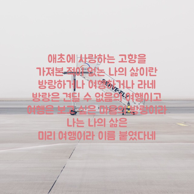 애초에 사랑하는 고향을 가져본 적이 없는 나의 삶이란방랑하거나 여행하거나 라네방랑은 견딜 수 없음의 여행이고여행은 보고 싶은 마음의 방랑이라나는 나의 삶은 미리 여행이라 이름 붙였다네W 상석.P Jannes Glas.