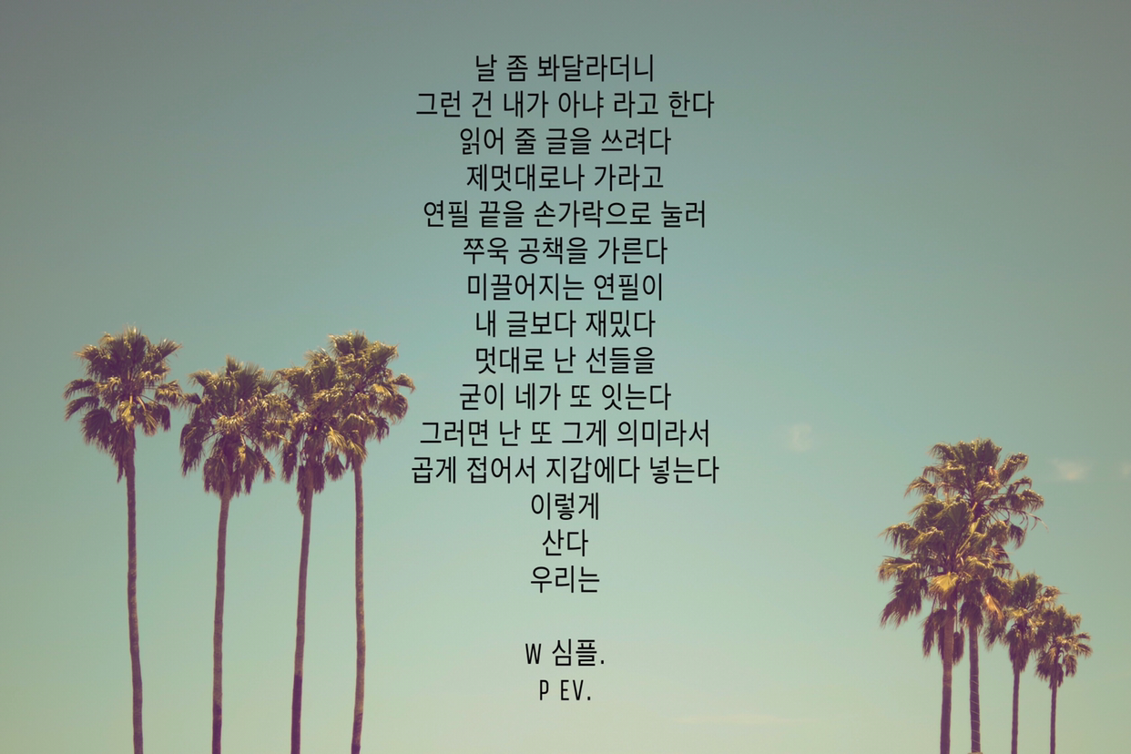 날 좀 봐달라더니그런 건 내가 아냐 라고 한다읽어 줄 글을 쓰려다제멋대로나 가라고연필 끝을 손가락으로 눌러쭈욱 공책을 가른다 미끌어지는 연필이내 글보다 재밌다멋대로 난 선들을굳이 네가 또 잇는다그러면 난 또 그게 의미라서곱게 접어서 지갑에다 넣는다이렇게 산다우리는W 심플.P Ev.