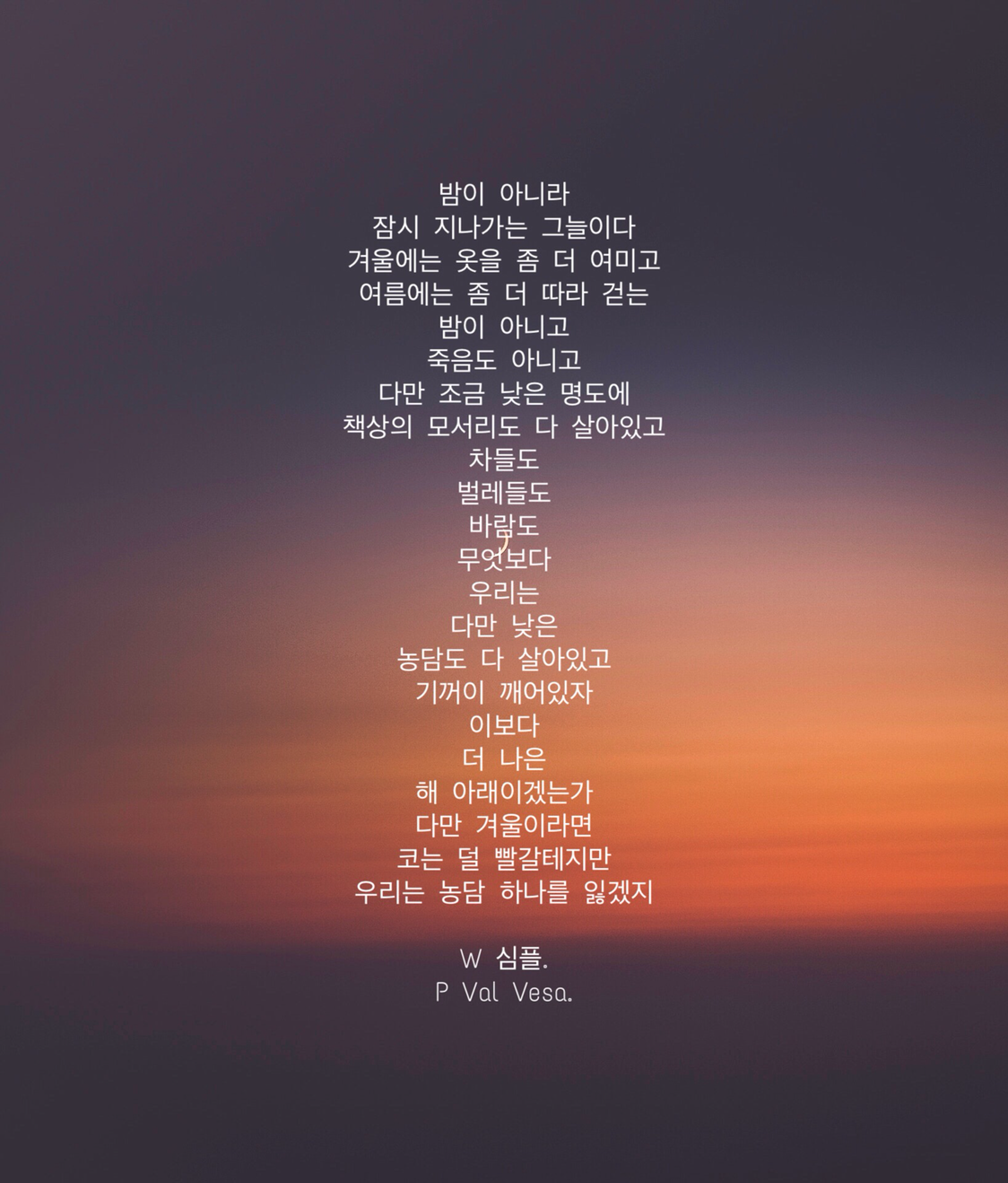 밤이 아니라잠시 지나가는 그늘이다겨울에는 옷을 좀 더 여미고여름에는 좀 더 따라 걷는밤이 아니고죽음도 아니고다만 조금 낮은 명도에책상의 모서리도 다 살아있고차들도 벌레들도바람도무엇보다 우리는 다만 낮은농담도 다 살아있고기꺼이 깨어있자이보다더 나은해 아래이겠는가다만 겨울이라면코는 덜 빨갈테지만우리는 농담 하나를 잃겠지W 심플.P Val Vesa.