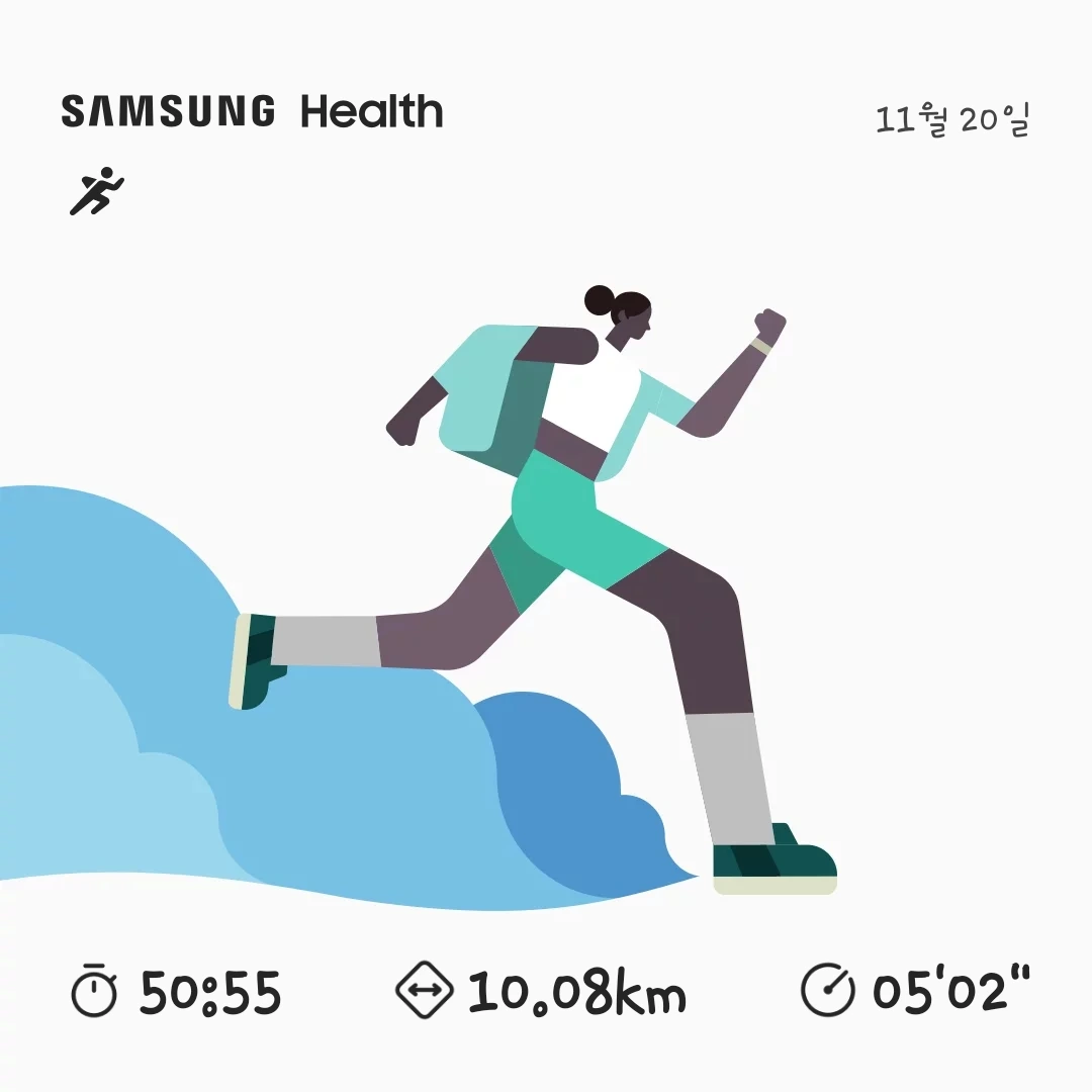 5km에서 8km 사이의 기록은 조금 더 좋았다. 가속도가 붙었을 것이고, 사진을 찍겠다는 압박감도 없었고, 상상의 힘으로 조용히 각자의 자리에서 달리며 서로를 응원하고 있었기 때문이었다. 9km 지점은 가장 힘이 들었다. 목표 거리에 닿기 위한 마지막 관문인 듯, 시련 없이 피는 꽃이 어디 있으랴. 뛰는 사람들에게 한 번쯤은 진지한 고민, 힘겨움, 가슴이 터질듯한 고통이 있어야 결승선을 통과할 때 더 의미 있고 기쁜 일이 아니겠는가, 고비를 넘기며 마지막 1km는 다시 힘을 내었다. 오늘의 기록도 나쁘지 않다. 50분 55초이다. 그러나 겸허하자. 나에게 건강한 신체를 물려주신 부모님께 감사하는 마음이다. 앞으로도 운동하며, 건강한 몸과 마음을 챙기며 기쁘게 살아갔으면 한다.