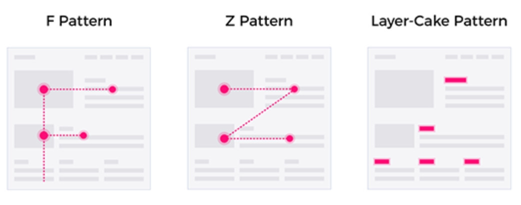 F패턴이 페이지 상단을 가로로 스캔한 후 왼쪽으로 내려가며 F자 형태로 콘텐츠를 훑는 것과 달리, 레이어 케이크 패턴은 주로 제목과 부제목을 중심으로 수평적으로 페이지 전체를 훑습니다. 모든 단어를 읽는 것을 제외하면, 이 패턴은 페이지에서 정보를 찾는 가장 효과적인 방법입니다.