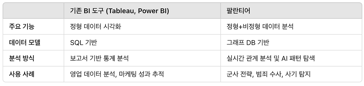 기존의 BI 도구들이 주로 데이터 시각화와 리포팅에 초점을 뒀다면, 팔란티어는 이를 넘어 전략적 의사결정 지원에 방점을 둡니다. 군사 작전, 테러 대응, 범죄 수사 같이 고도의 상황 판단이 요구되는 영역에서 위력을 발휘하는 이유입니다. 최근에는 금융, 제조, 헬스케어 등 다양한 산업에서도 도입이 확대되고 있습니다.
