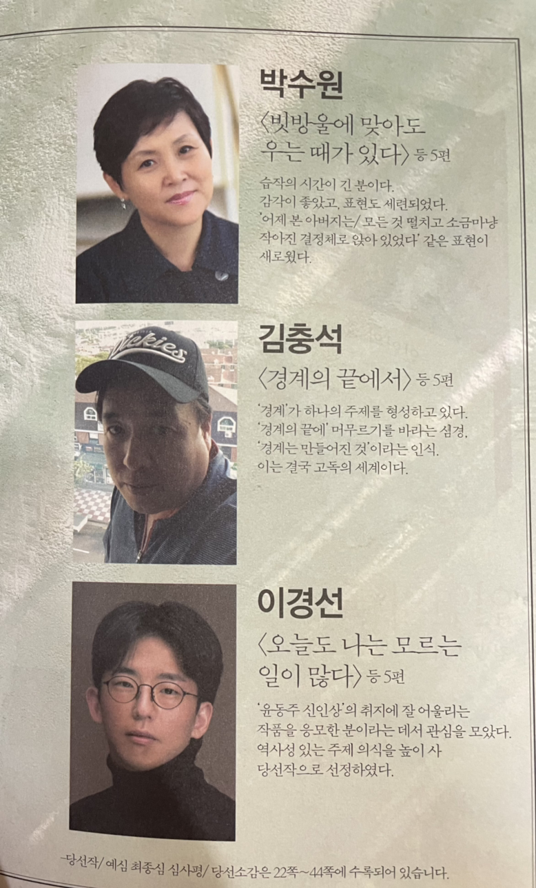 - 서울시인협회 주관 『윤동주 신인상』 당선 소감