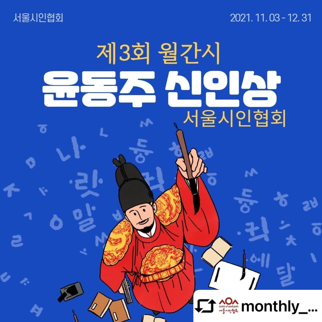 '새벽이 오면 나팔소리 들려올' 거라며 조국의 독입을 애타게 기다리다가 '아아 젊음은 오래 거기 남아 있거라' 외치며 '죽는 날까지 하늘을 우러러' '별을 노래하는 마음으로' '나한테 주어진 길을 가야겠다'는 대한민국의 영원한 청년시인 윤동주를 기리기 위해 새로운 시를 쓰려고 정진하는 시인들을 찾고 있습니다.