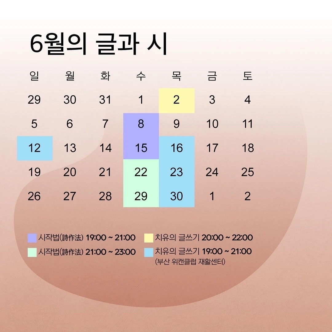 6월 '치유의 글쓰기' 및 '시작법' 수업 일정입니다.