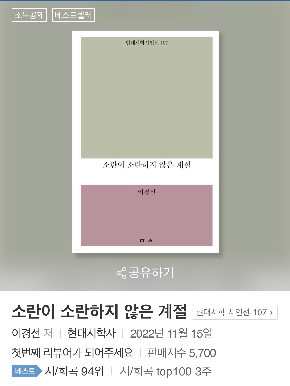 yes24 시/희곡 top100 3주를 달성했습니다.