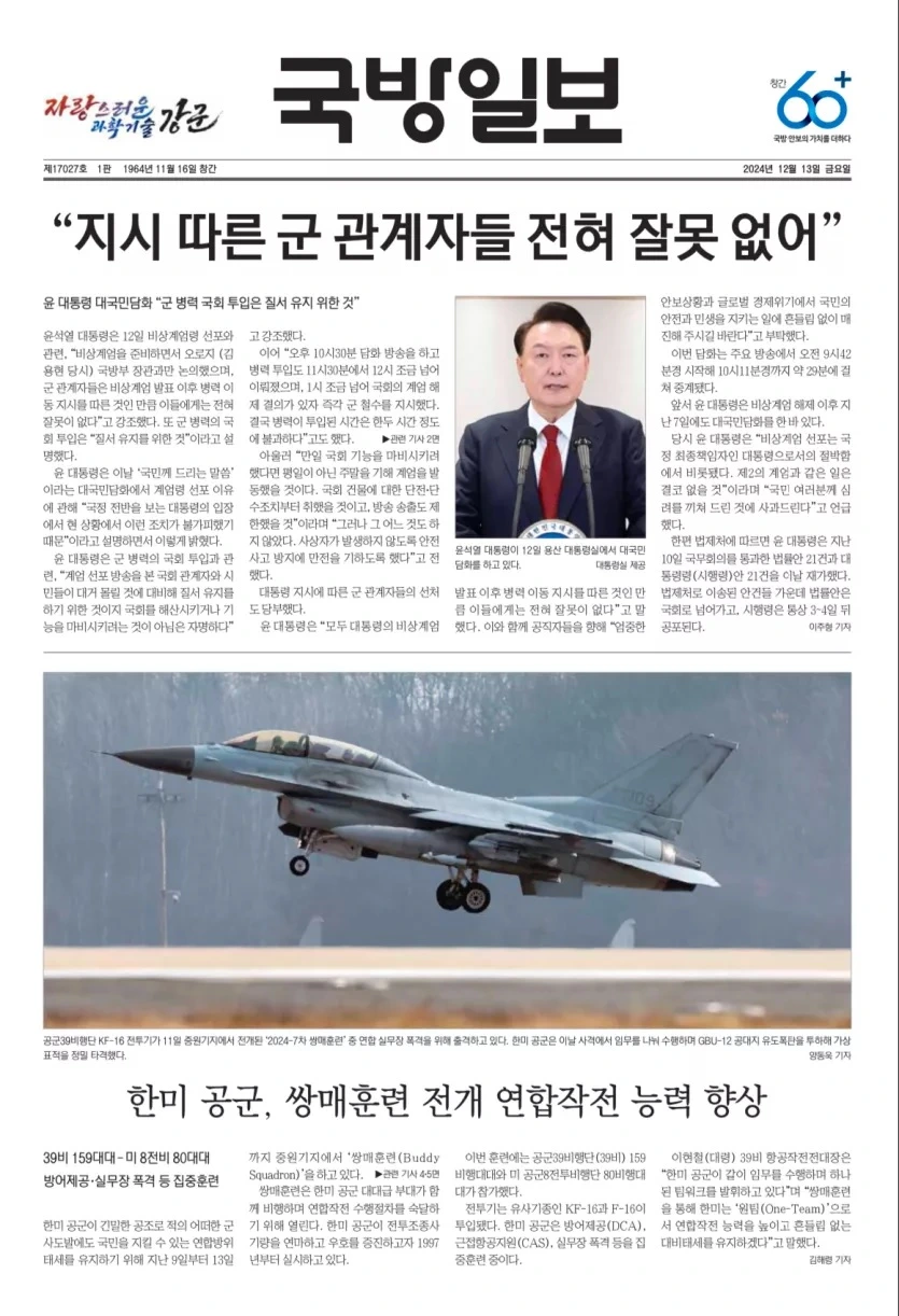국방일보는 군대 장병들이 보는 신문이다. 12월 13일 국방일보는 대통령의 명령에 따라 출동한 군인은 잘못이 없다는 기사를 실었다.