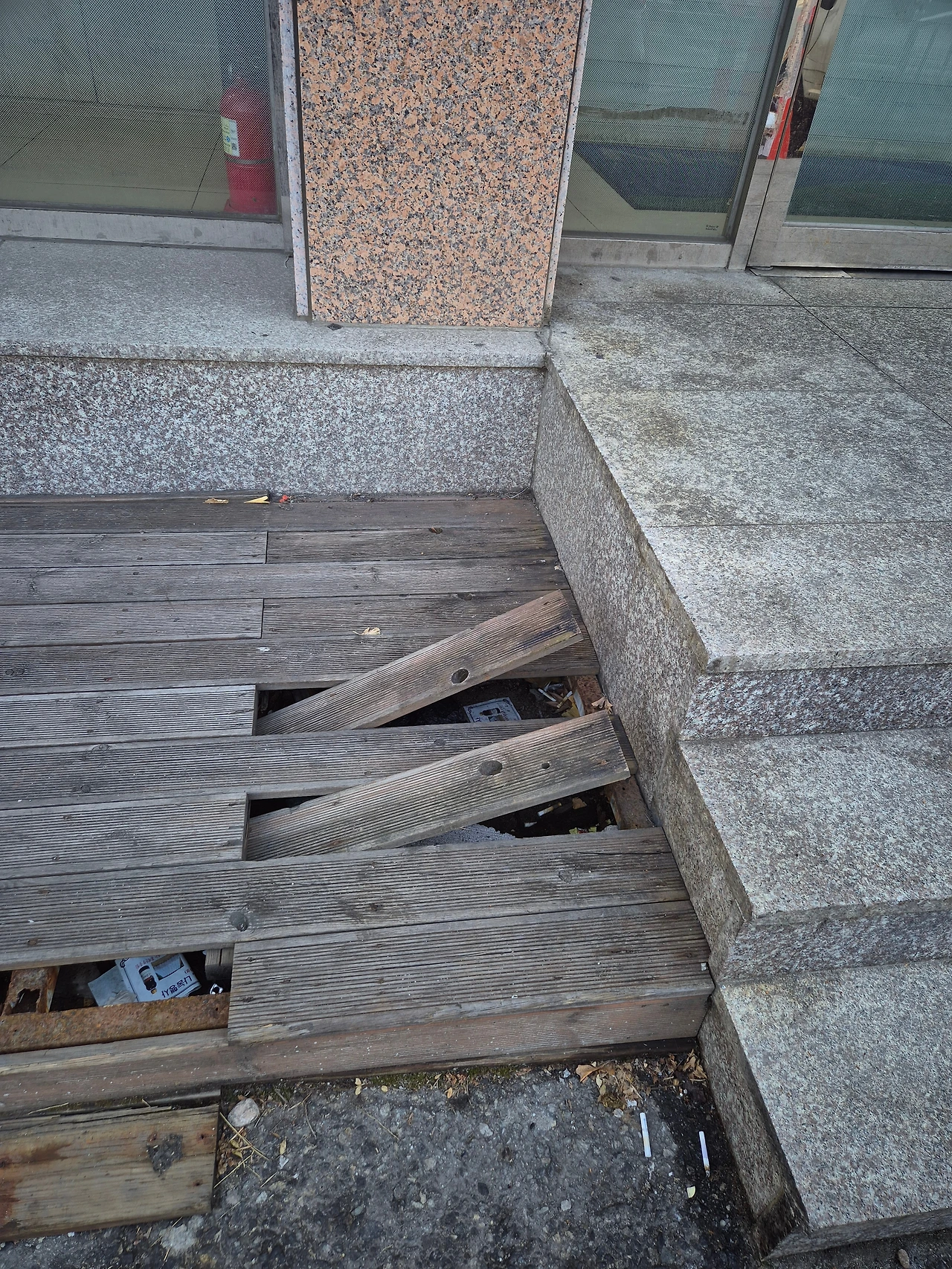 장기동 흉을 봤는데, 개봉동 경서농협 앞에 ATM기를 이용하다가 기겁을 했다. 어떻게 데크가 망가져도 위험표지가 없어?
