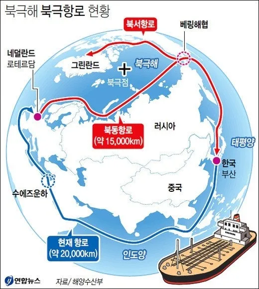 우리나라 수출품이 부산항, 인천항, 평택항에서 출발해 유럽에 도착하려면 동남아를 우회하여 갔다. 이제 북극항로가 정식으로 화물선이 통과하게 되면 부산항은 지금도 국제항이지만 더 그 쓰임새가 큰 국제항이 될 것이다. 이쟤명 대통령이 그거까지 생각하고 해양수산부와 가장 큰 해운회사를 부산으로 이전시킨다는 선거공약을 했는지 알 수 없으나, 잘 되는 사람은 소가 뒷걸음치다 생쥐잡거나 도랑치고 가재 잡는 일이 생긴다.