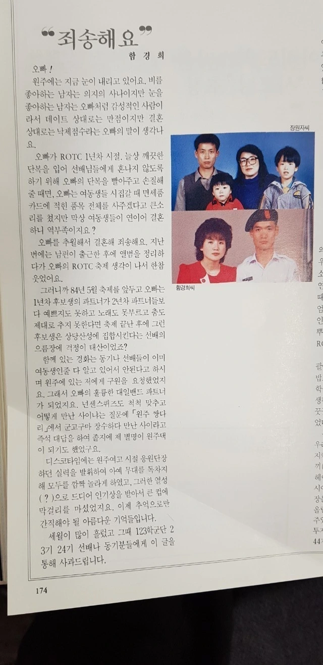 1년차 학군단 축제 빨강옷 경희다. 그 축제 후 오빠 앞으로 절대 연애하지마. 내가 원주여고 마치고, 이화여대, 숙명여대간 후배 중에서 일단 자기 정도 미모 갖추고, 예의범절도 할아버지, 할머니, 아버지, 어머니 네 분 맘에 쏙들 여자 소개시켜 줄게 하고는 내가 전방서 외롭게 총각 소대장으로 지낼 때 결혼했다.
