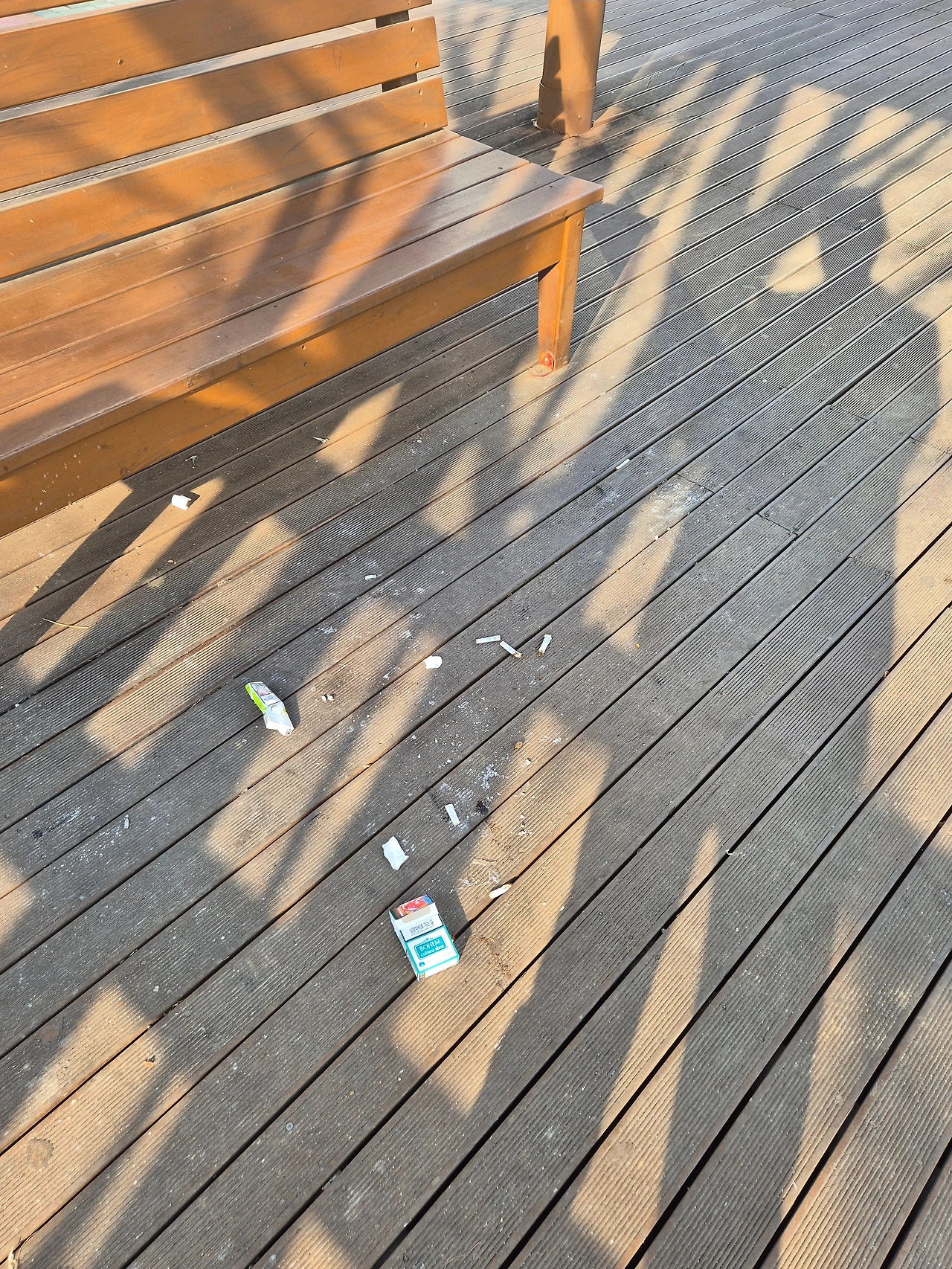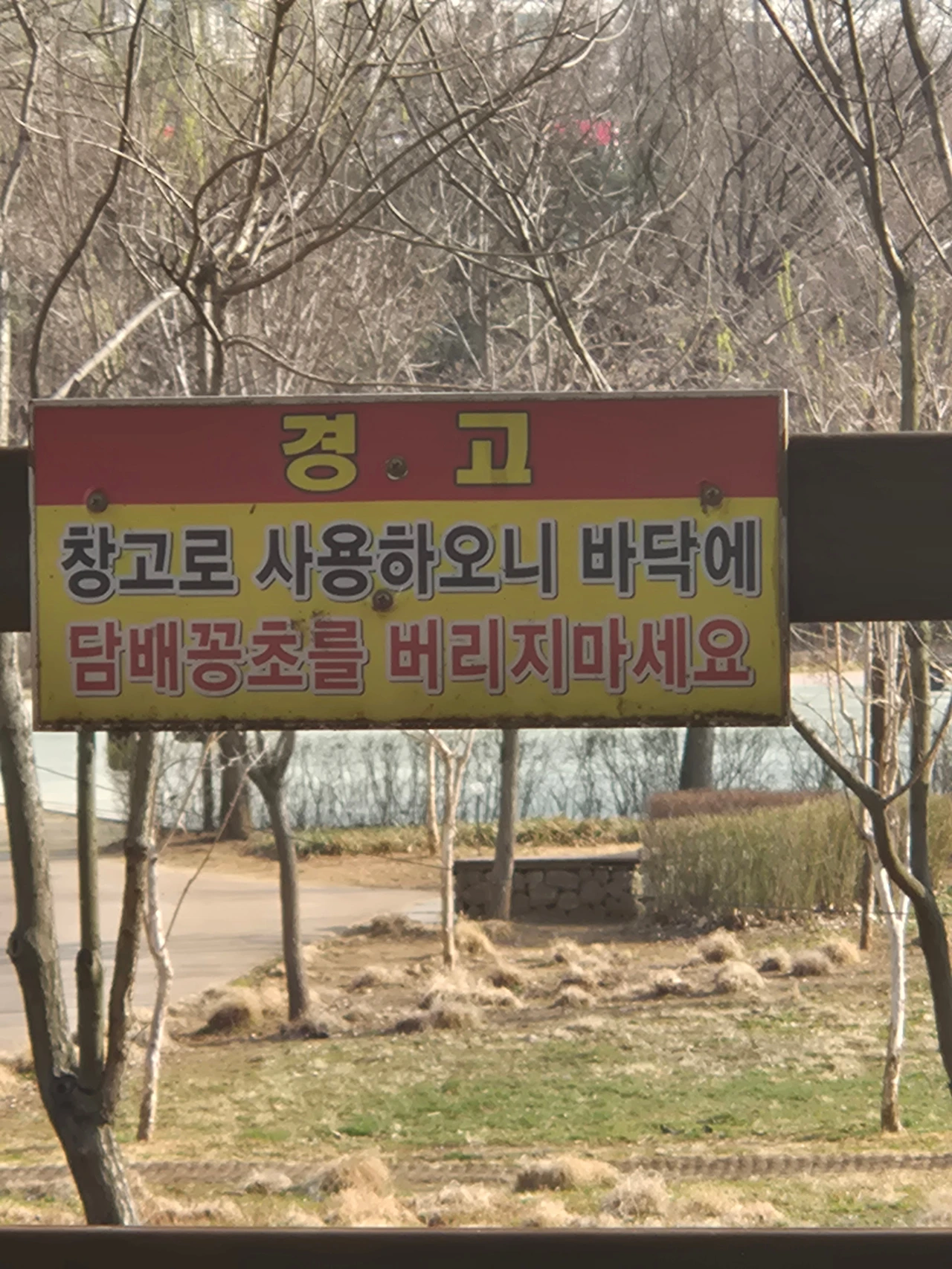 매일 만 보 이상 걸으라는 주치의 지시에 목감천을 걷고 집으로 가는 길에 쉬어가는 정자가 있다. 경고 문구가 있어도 꼭 담배꽁초를 버리는 인간이 있다. 개봉동이나 구로구청은 온천지 CCTV인데, 이런 곳에는 왜 설치 안 하나 모르겠다. 이런 놈은 적발해 벌금 300만 원을 물려야 한다. 작가가 인세가 적어 이사를 못 가는데, 로또라도 맞으면 당장 개봉동을 떠나고 싶다.