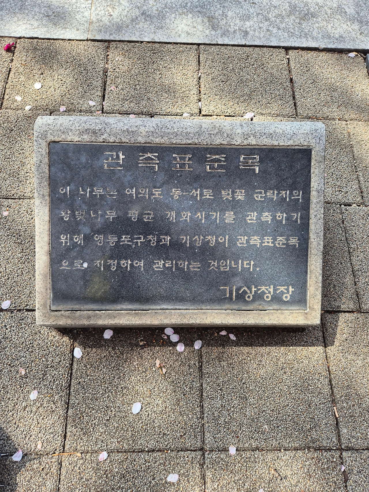 이 나무가 벚꽃 폈다는 뉴스 기준이라고 합니다. 이 나무에 벚꽃이 4송이 이상 피면 뉴스에 서울에 벚꽃이 폈습니다. 뉴스방송하는 기준목입니다.