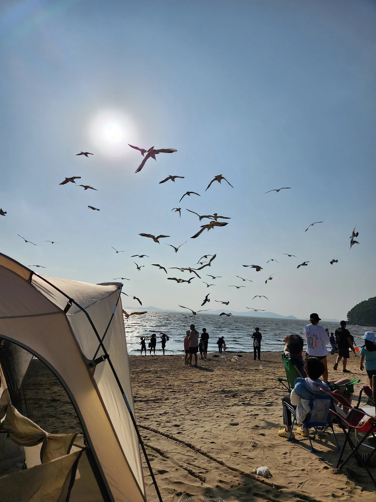 바다 가까이 텐트를 쳤는데 안전요원이 오더니 물이 점점 올라오고 있으니 텐트를 이동하라고 했다.
