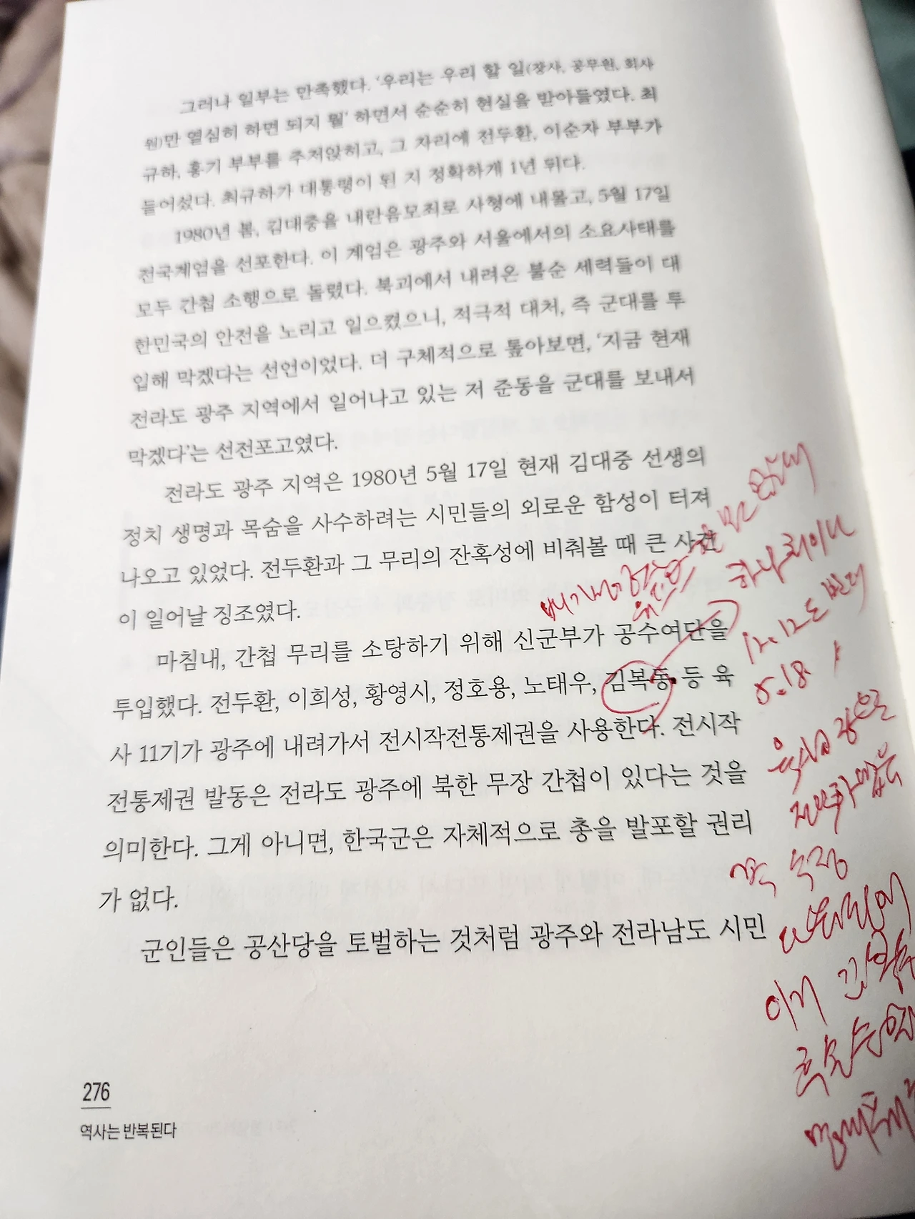 이 책 거의 끝부분에 전두환과 하나회 이야기가 나오는데, 12.12와 5.18에 김복동 장군을 넣었기에 출판사에 전화를 걸어 이미 초판 나온 것을 할 수 없지만 만약 재판을 발행한다면 하나회에 김복동이 가담한 것은 사실이지만 요즘 뜨는 영화 <서울의 봄>에 김복동은 가담 안 한다. 빼달라고 요청했다.