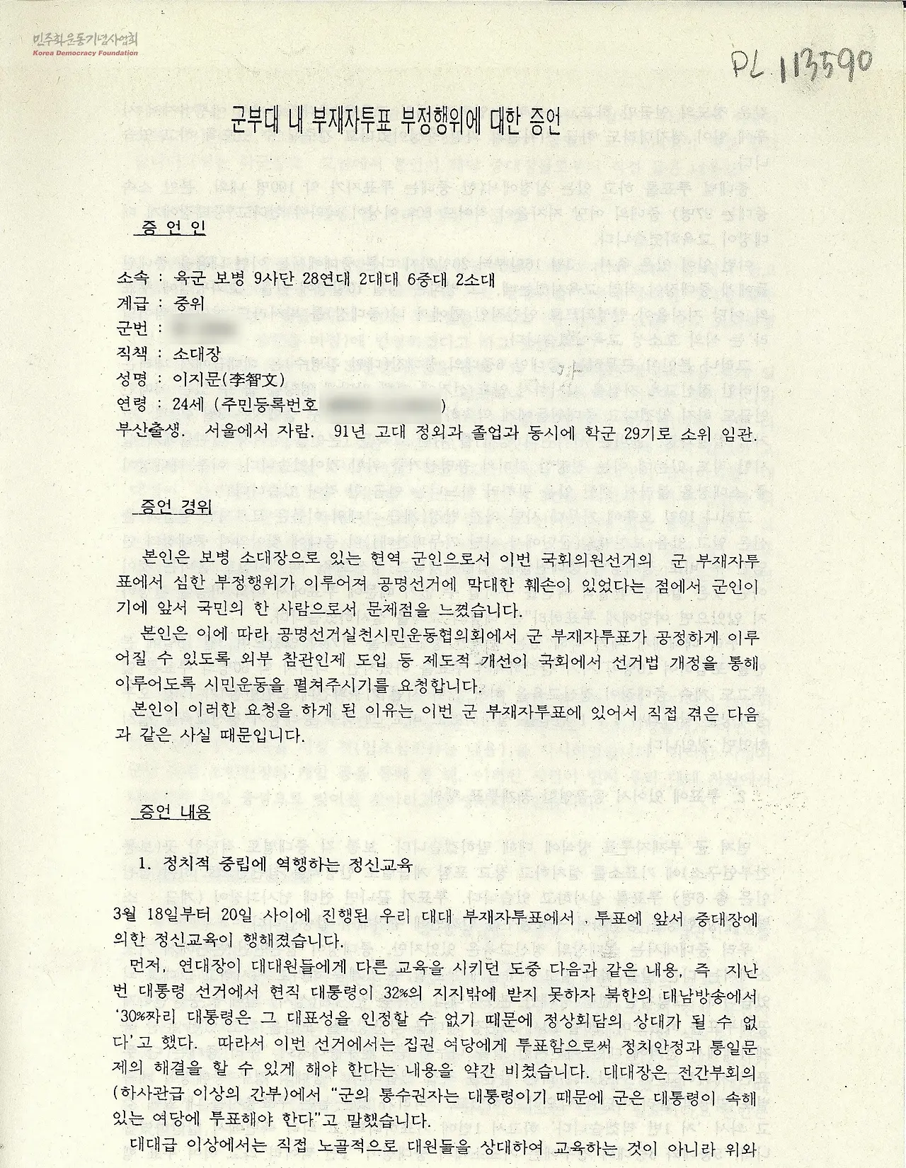이지문 중위는 ROTC 후배였는데, 1992년 3월 22일 <공명선거 실천 시민운동 협의회>에 자발로 가서 기자회견을 했다.