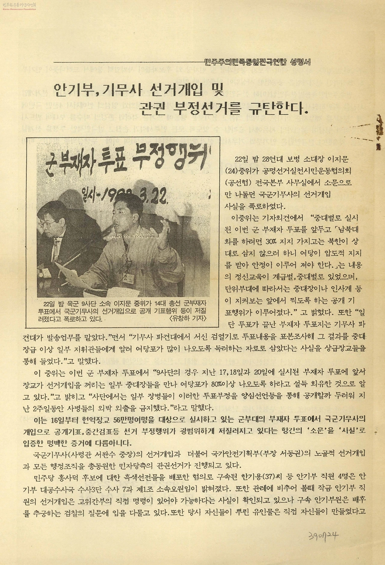 국회의원 선거 군부대 부재자 투표는 집권여당에 유리한 투표를 강요한다는 내용이었다.