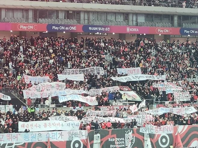 상암 월드컵 경기장에 붉은 악마들이 국가대표 선수에 대한 응원은 하지만 정몽규 축구협회장 나가라는 구호를 외치고 사전에 <몽규