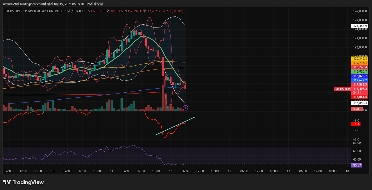 현재 볼린저 밴드 4/4 밴드 하단을 이탈하며 원비(유튜브 김직선님 이론)를 돌파하였다.