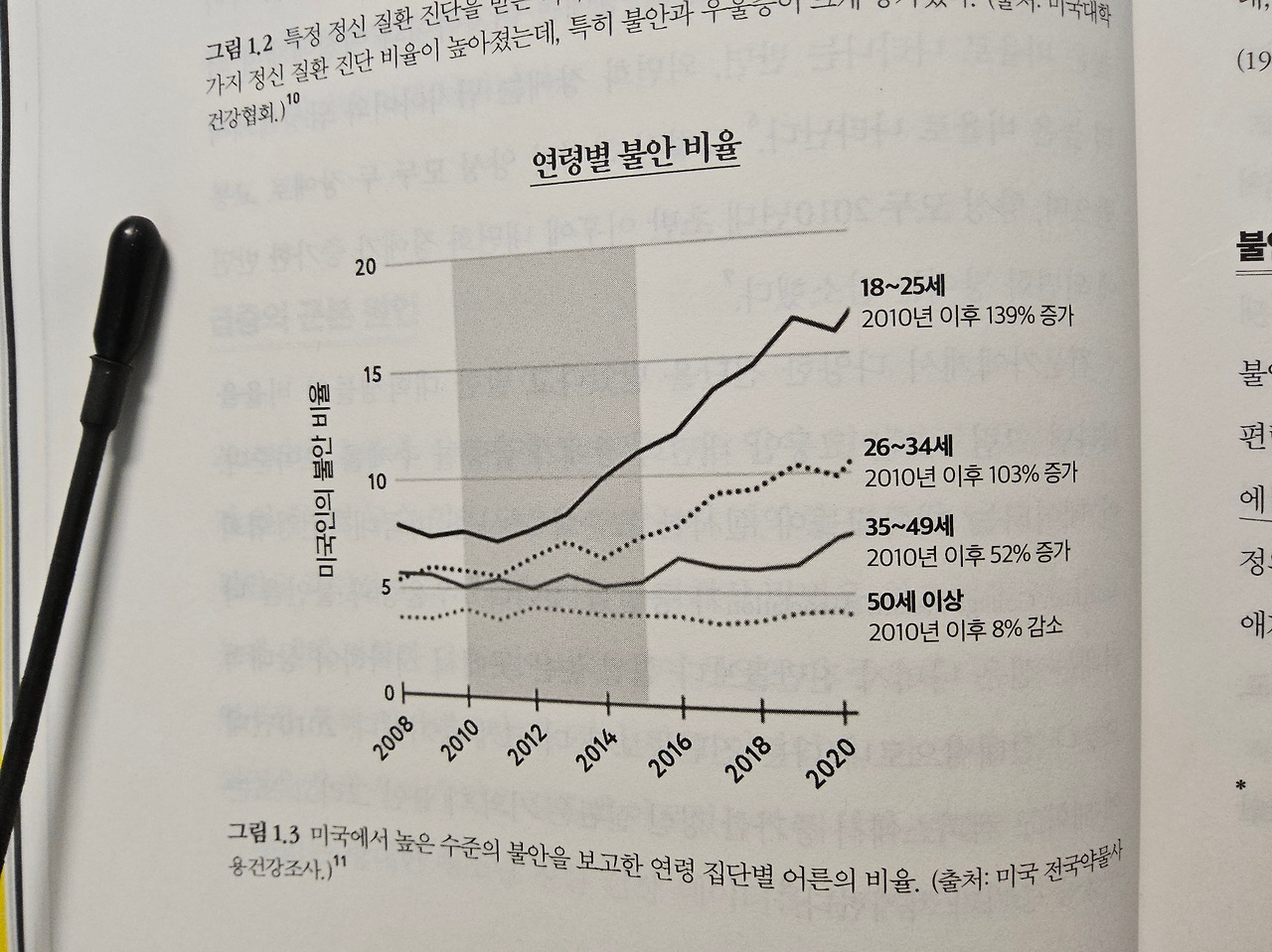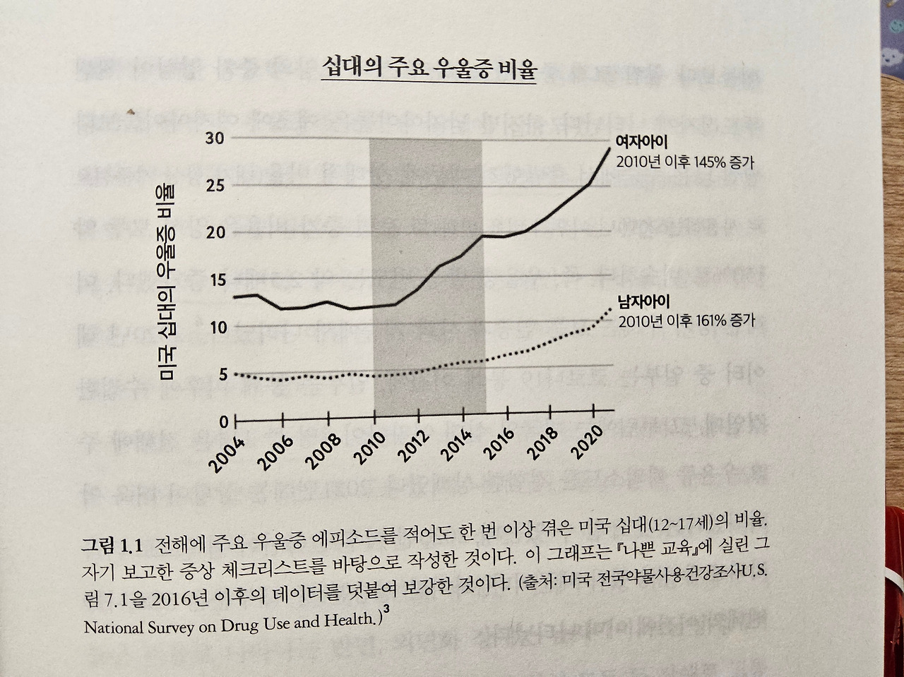 2020년 즈음, 전체 미국 18~25세 중 15% 이상이 불안하다고 응답했고 10대 여자아이 10명 중 3명, 남자아이 10명 중 1명 가량이 우울하다고 답했다. 표를 보면 알겠지만, 과거의 10대와는 그 레벨이 다르다.