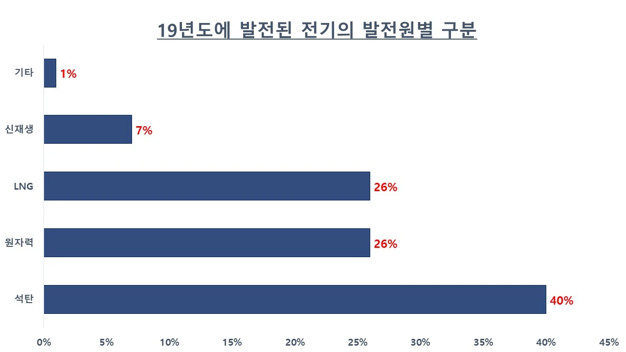 우리는 주위에서 '원전' 이야기를 많이 듣는다. 그래서 전기 생산량에서 원전 비중이 가장 높다고 생각할 수 있는데, 실상은 아니다. 석탄 비중이 40%로 가장 높고, 원전이 26%, LNG가 26%를 차지한다. 석탄 태워서 얻는 전기가 진짜 많다.