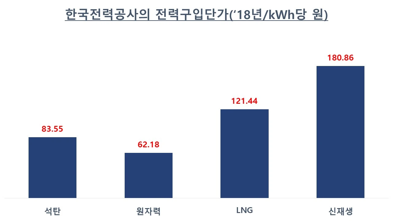 왜 석탄을 많이 쓰냐고? 이유는 간단하다. 전기를 싸게 생산할 수 있기 때문이다. 아래 그래프를 보면 알겠지만, 전력 1단위에 소요되는 생산비용이 석탄은 낮다. 우리나라의 산업 구조는 제조업 중심이다. 모든 제품과 서비스의 기본원료인 전기를 비용효율적으로 생산하는게 꽤 중요했다.