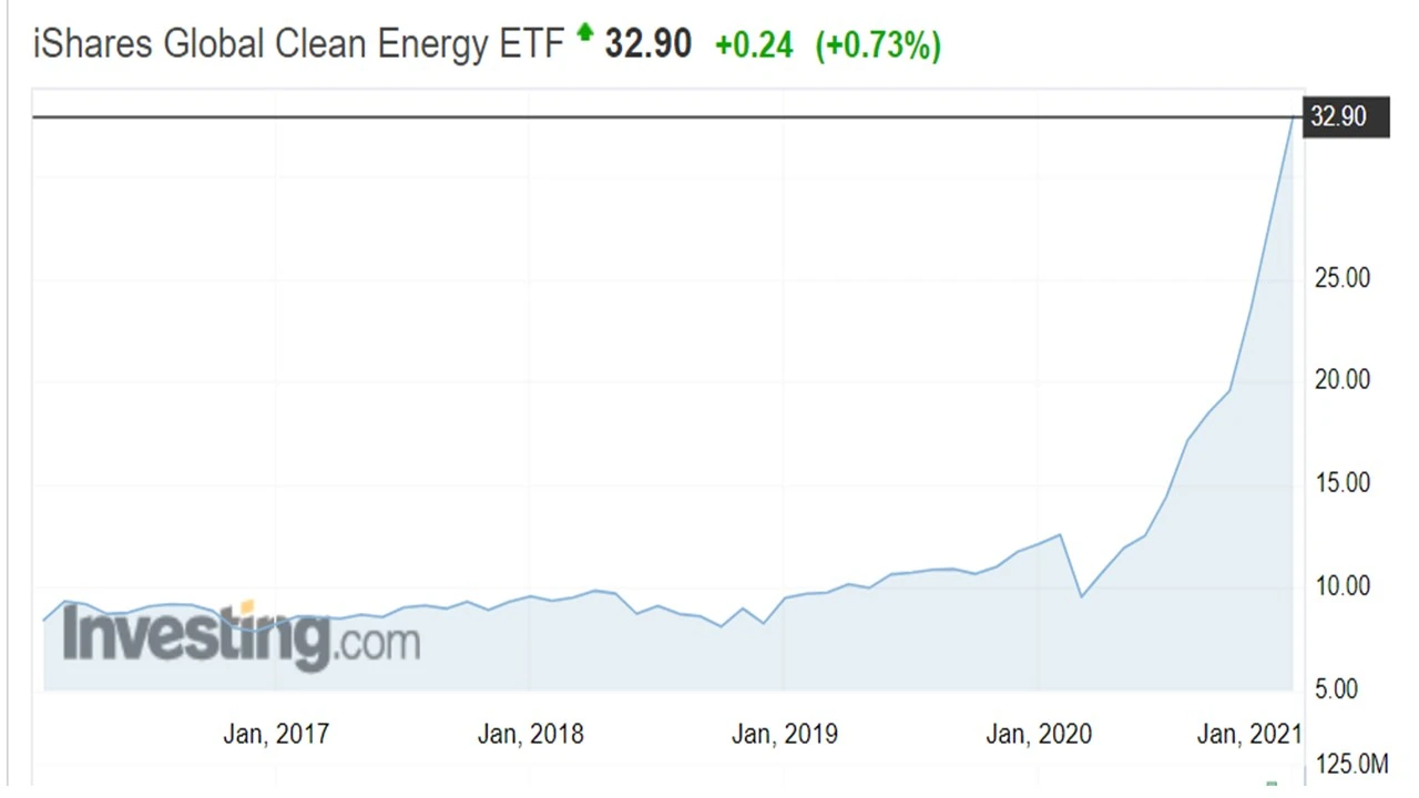 '친환경 산업'은 돈이 되는 유망 산업이기도 하다. 아래의 그래프는 미국의 친환경 기업들을 묶어놓은 ETF다. 작년에 비해 2배 이상 올랐다. 주식시장은 기업과 산업의 미래를 선반영한다. 태양광, 풍력 등 친환경 기업들이 '수익을 창출'할 것 같으니까, 여기로 돈이 몰리는 거다. 돈은 냉정하고 현실적이다.