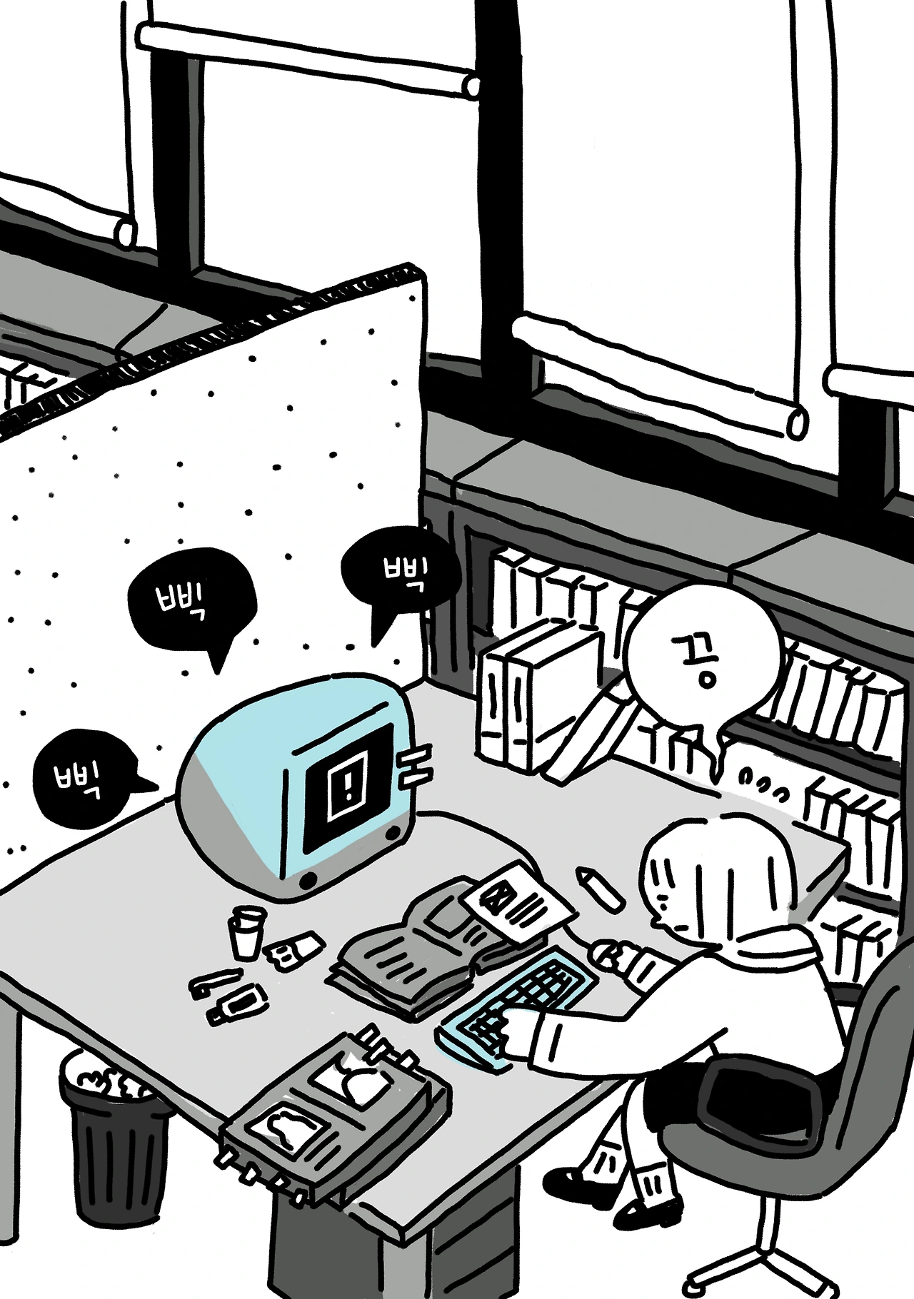 시무는 출판사 근무 첫 날인 월요일, 선배가 알려준 자리로 가 앉았다.