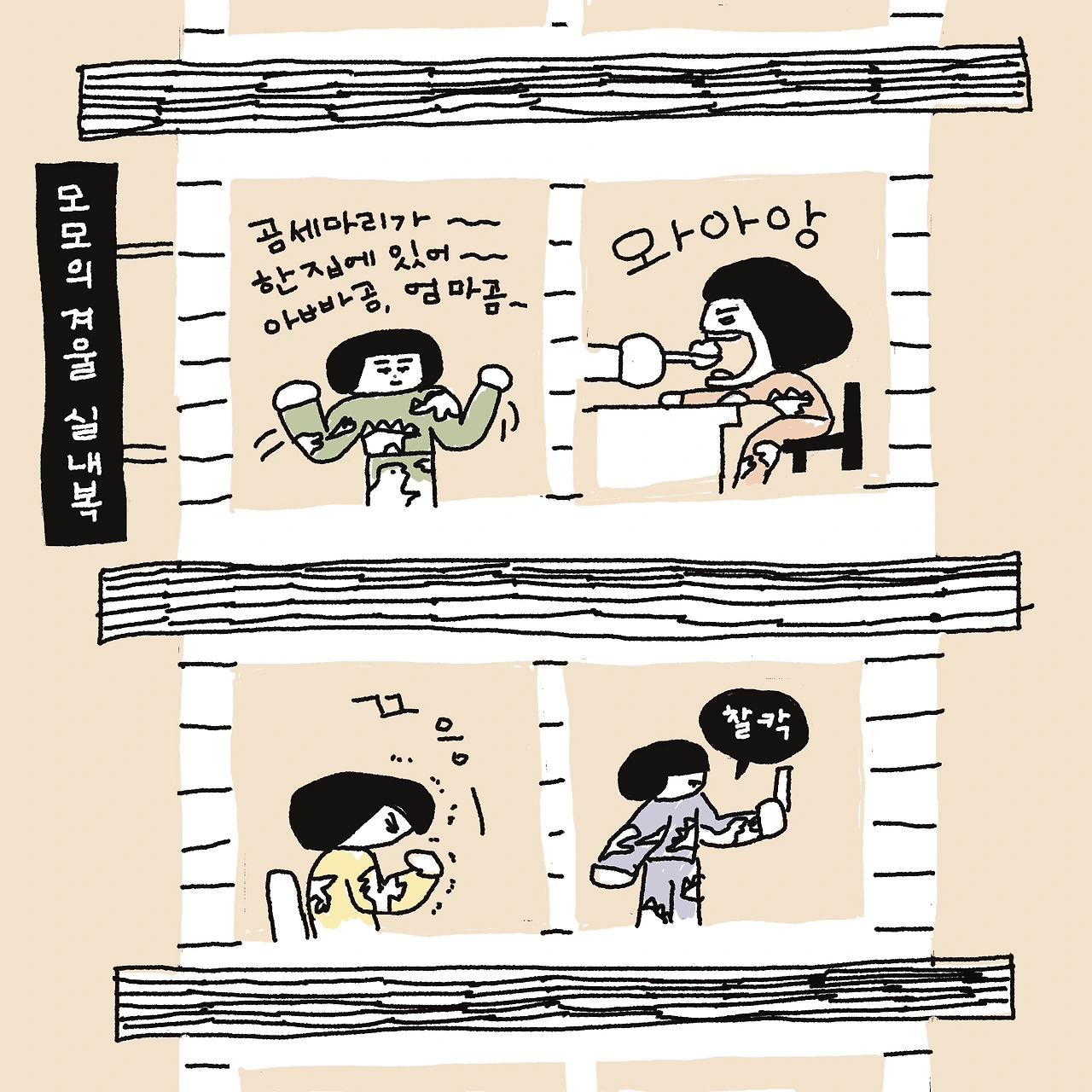 모모는 겨울 실내복으로 공룡 내복을 즐겨 입는다. 각종 색깔의 공룡이 그려진 내복이 여러 벌 있어 그중 아무거나 입혀줘도 군말 없이 착용한다. 이 내복들은 멀리서 보면 비슷해 보이지만 자세히 보면 공룡을 그린 도구가 사인펜인지 붓인지 알아볼 수 있을 정도로 그림을 그린 작가의 화풍이 엿보인다. 모모는 여러 벌의 내복 중 어느 것도 편애하는 법 없이 모두 평등하게 사랑해 준다.