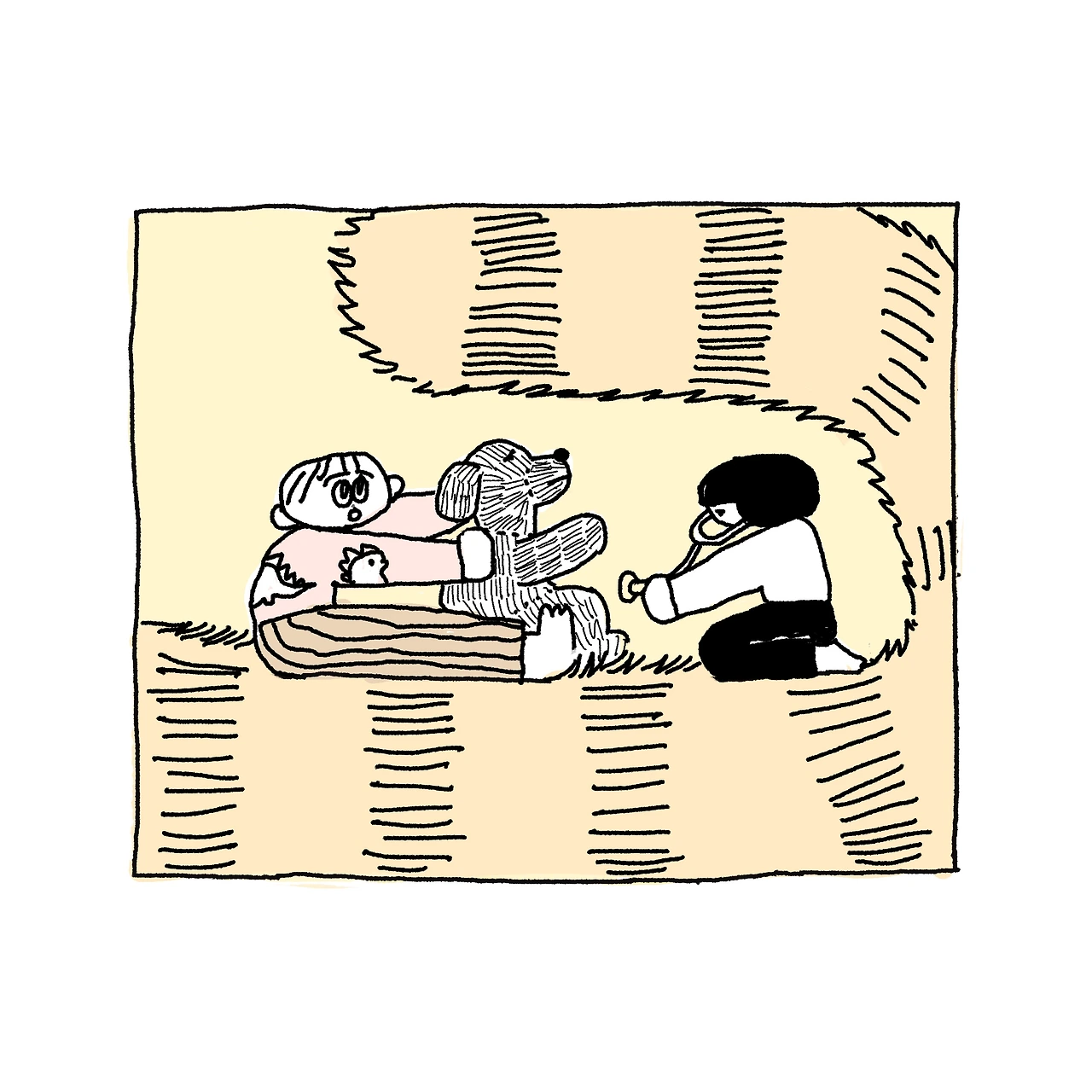 리리는 병원놀이를 할 때에도 공룡티와 코르덴 바지다.