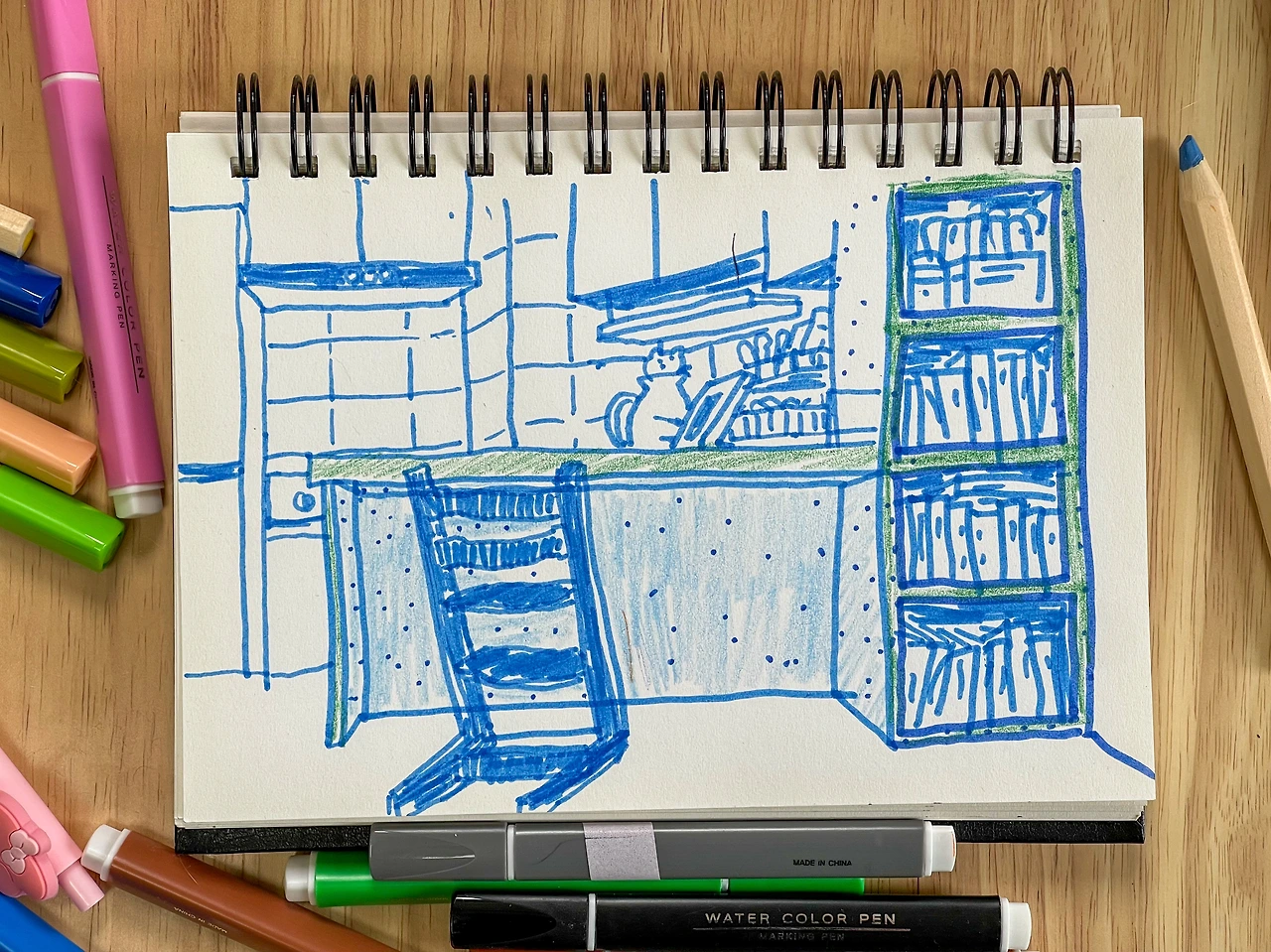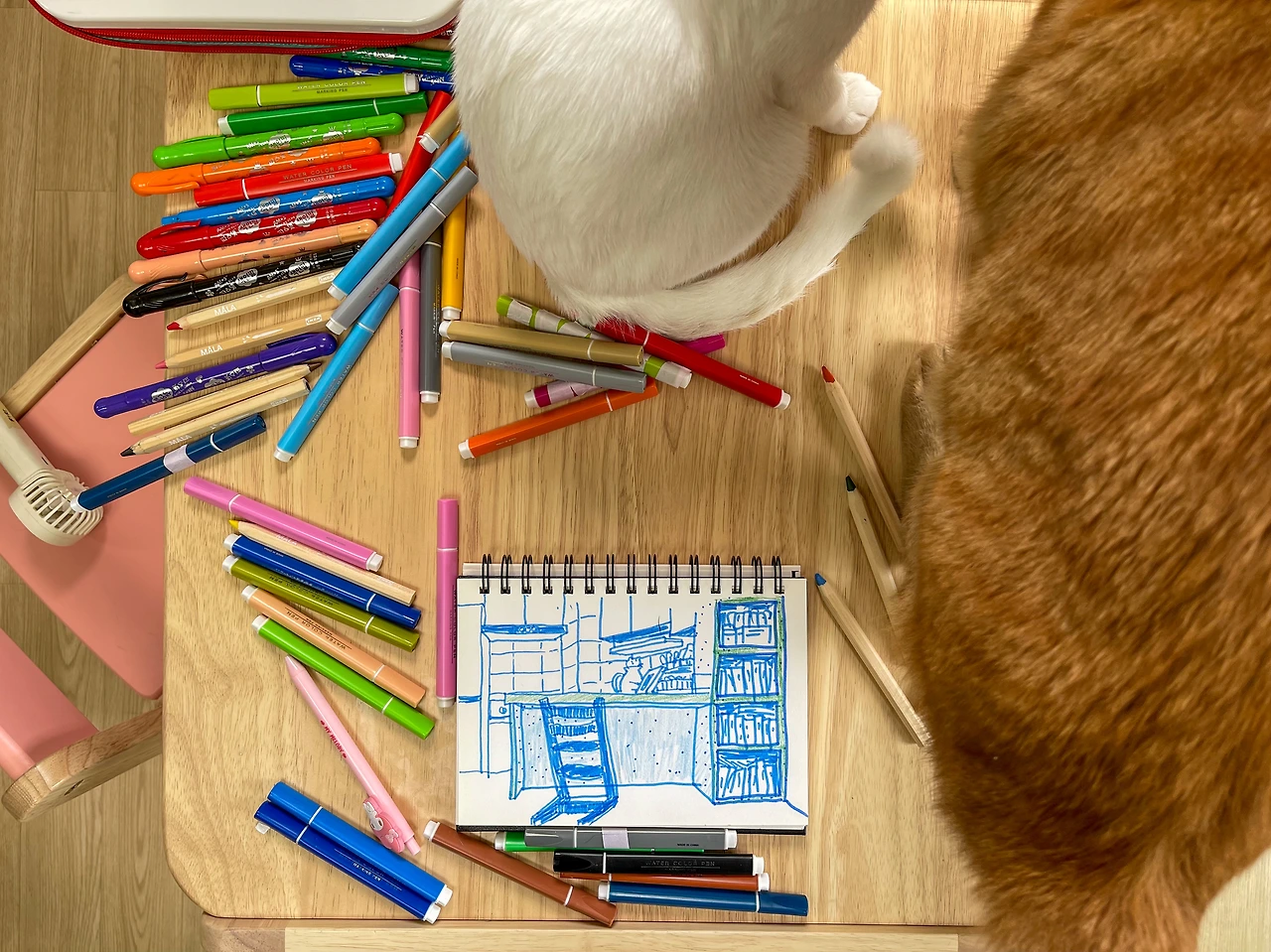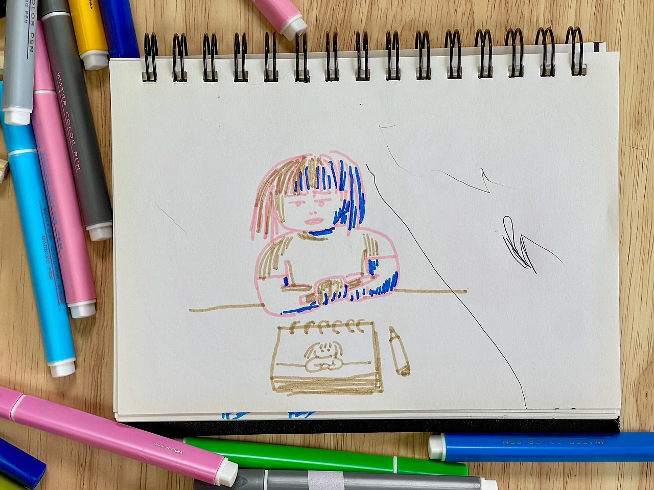 평소보다 일찍 일어난 모모가 책상 앞에 앉아서 펜을 다 늘어놓았다.