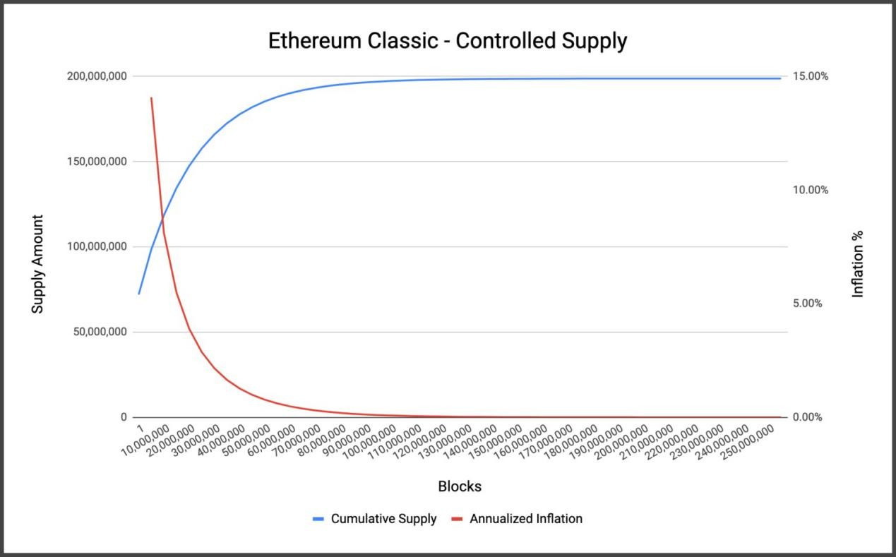 위의 이미지에서 알 수 있듯, 이더리움 클래식의 연간 인플레이션 비율은 비트코인과 유사하게 하락한다. 2025년에서 2036년 사이의 인플레이션 비율은 약 4%에서 1% 미만으로 하락하며, 2033년인 33번째 시대에 들어서면 인플레이션 비율은 0%에 수렴한다.