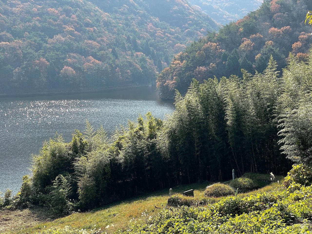 저수지 기슭에 다가가니 대나무인가 싶은 나무를 병풍처럼 두른 무덤을 발견했다. 와... 저 집안사람들은 이런 장소를 어찌 알고 묘를 썼을까. 근래 본 묘 중에 가장 자연스럽고 아름답다.