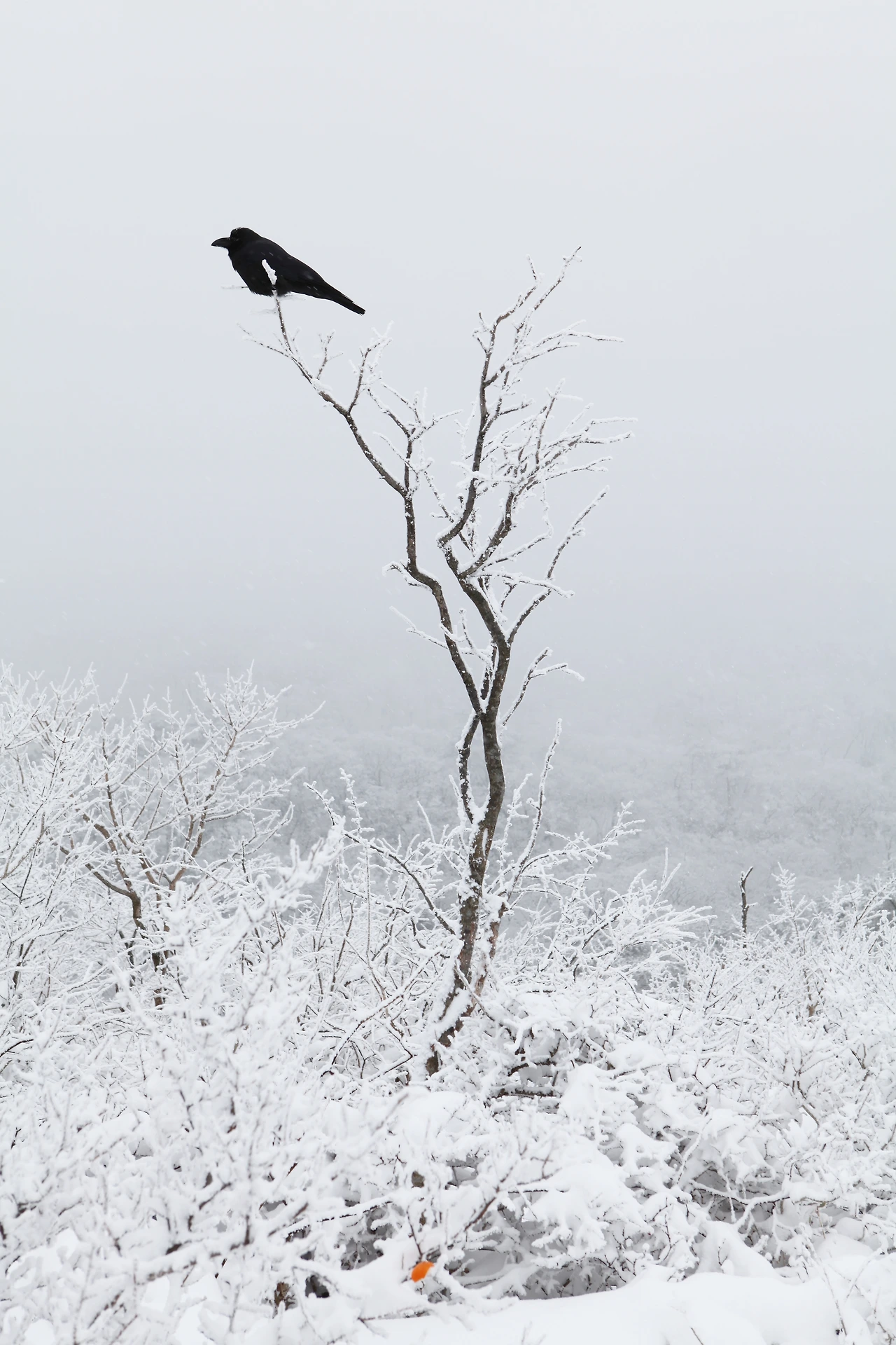 등산로 입구를 통과해 첫 코너를 도는 순간 무성 흑백영화 속으로 발을 디딘 그 느낌. 눈이 소리를 가두어 귀가 먹먹하도록 고요한 하얀 세상에, 뽀드득 내 발자국 소리만 뭉퉁했다. 조금 오르다 보니 눈이 내리기 시작했는데, 눈이 가지에 내려앉을 땐 작게 '사각' 하는 소리가 들린다. 하얗게 정지된 세상에 유일하게 움직이는 검은 까마귀는 그날따라 울음소리도 내지 않았다. 소리 없이 하얀 세상을 날다 가지에 앉아 나를 응시하는 까마귀. 한라산의 산신령은 까마귀다.